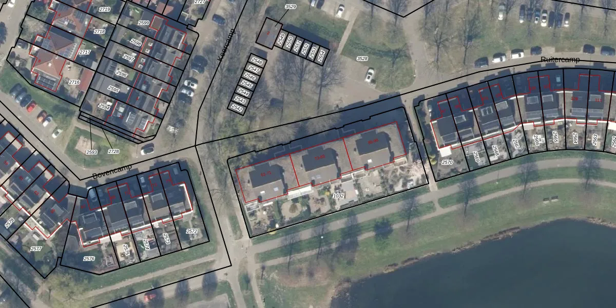 Het perceel waarop Ruitercamp 77 staat heeft een oppervlakte van 1580 m². Dit is een zeer groot perceel. De perceeloppervlakte wordt geregistreerd door het Kadaster. Gedetailleerde informatie over de maten van dit perceel kunt u vinden in het rapport Kadastrale kaart met maatvoering van Ruitercamp 77.