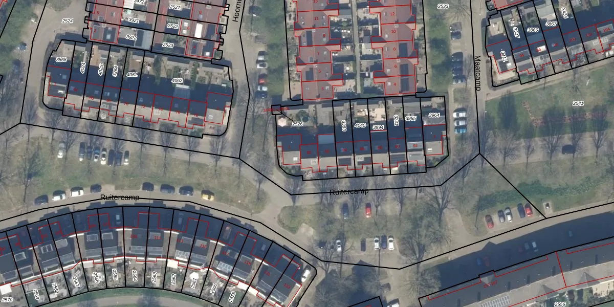 Het perceel waarop Ruitercamp 80 staat heeft een oppervlakte van 3076 m². Dit is een zeer groot perceel. De perceeloppervlakte wordt geregistreerd door het Kadaster. Gedetailleerde informatie over de maten van dit perceel kunt u vinden in het rapport Kadastrale kaart met maatvoering van Ruitercamp 80.