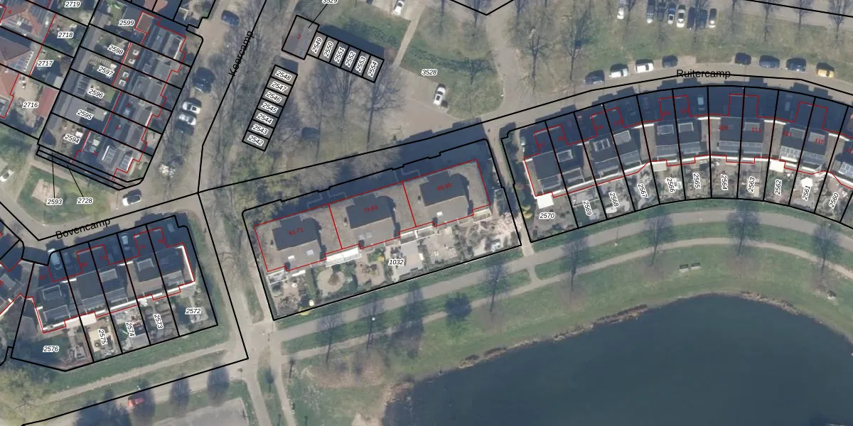 Het perceel waarop Ruitercamp 85 staat heeft een oppervlakte van 1580 m². Dit is een zeer groot perceel. De perceeloppervlakte wordt geregistreerd door het Kadaster. Gedetailleerde informatie over de maten van dit perceel kunt u vinden in het rapport Kadastrale kaart met maatvoering van Ruitercamp 85.