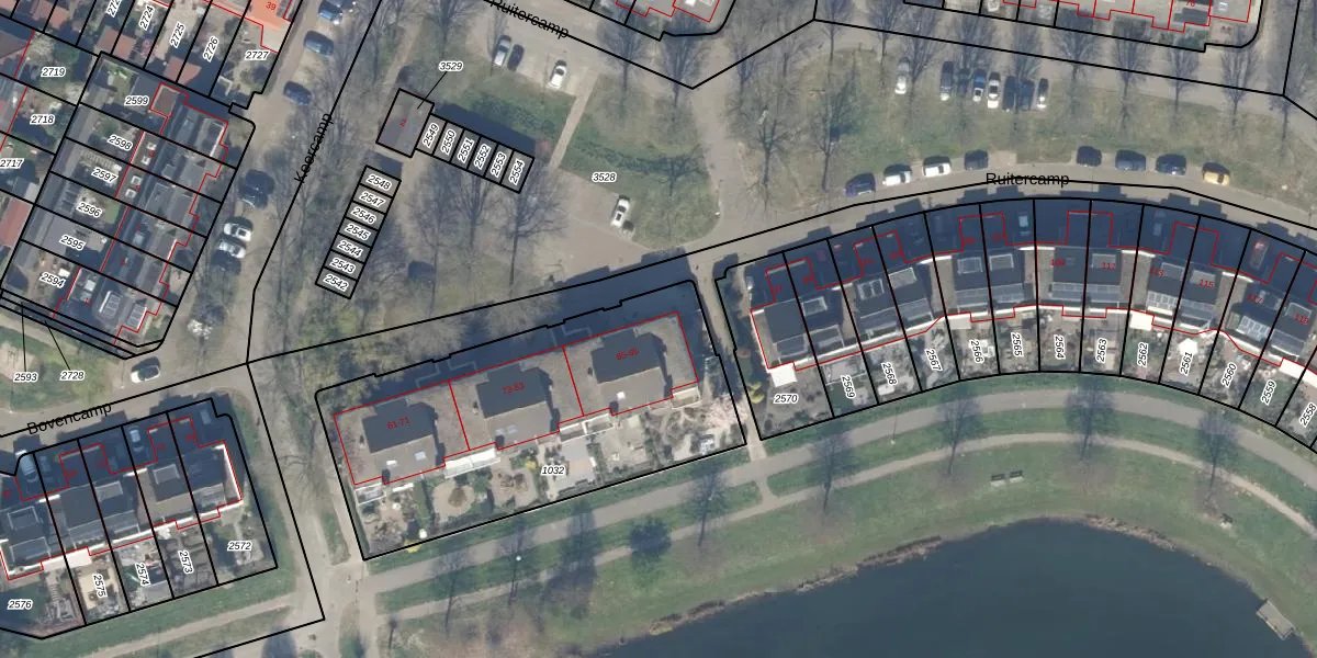 Het perceel waarop Ruitercamp 95 staat heeft een oppervlakte van 1580 m². Dit is een zeer groot perceel. De perceeloppervlakte wordt geregistreerd door het Kadaster. Gedetailleerde informatie over de maten van dit perceel kunt u vinden in het rapport Kadastrale kaart met maatvoering van Ruitercamp 95.