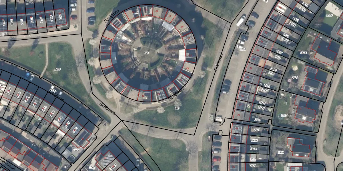Het perceel waarop Schijfmos 15 staat heeft een oppervlakte van 2554 m². Dit is een zeer groot perceel. De perceeloppervlakte wordt geregistreerd door het Kadaster. Gedetailleerde informatie over de maten van dit perceel kunt u vinden in het rapport Kadastrale kaart met maatvoering van Schijfmos 15.