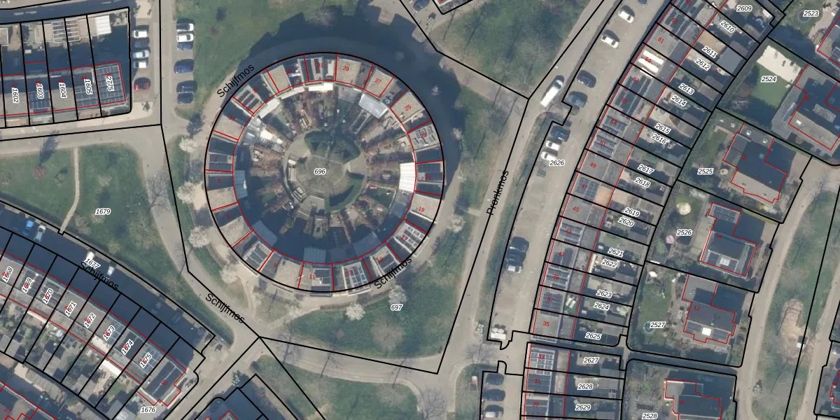 Het perceel waarop Schijfmos 19 staat heeft een oppervlakte van 2554 m². Dit is een zeer groot perceel. De perceeloppervlakte wordt geregistreerd door het Kadaster. Gedetailleerde informatie over de maten van dit perceel kunt u vinden in het rapport Kadastrale kaart met maatvoering van Schijfmos 19.
