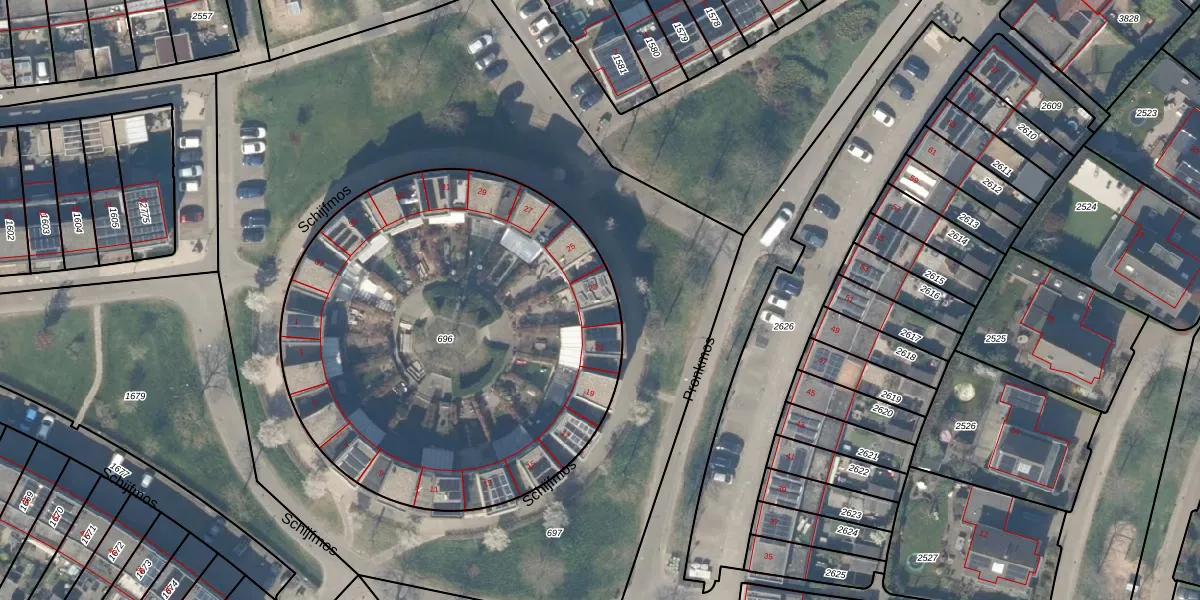 Het perceel waarop Schijfmos 23 staat heeft een oppervlakte van 2554 m². Dit is een zeer groot perceel. De perceeloppervlakte wordt geregistreerd door het Kadaster. Gedetailleerde informatie over de maten van dit perceel kunt u vinden in het rapport Kadastrale kaart met maatvoering van Schijfmos 23.