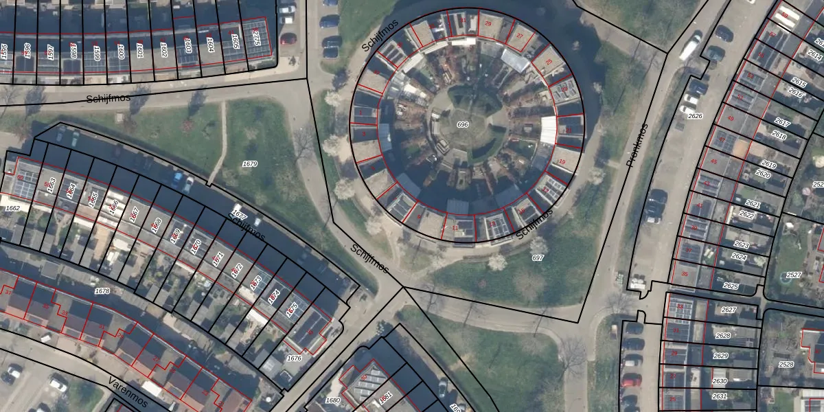 Het perceel waarop Schijfmos 7 staat heeft een oppervlakte van 2554 m². Dit is een zeer groot perceel. De perceeloppervlakte wordt geregistreerd door het Kadaster. Gedetailleerde informatie over de maten van dit perceel kunt u vinden in het rapport Kadastrale kaart met maatvoering van Schijfmos 7.