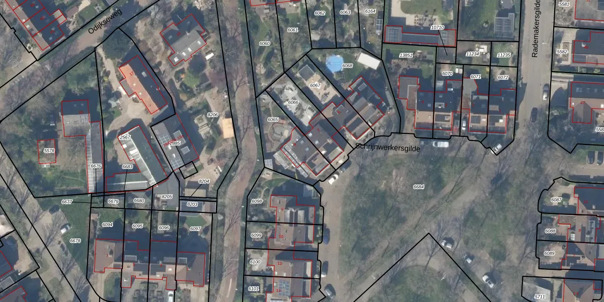 Het perceel waarop Schrijnwerkersgilde 8 staat heeft een oppervlakte van 405 m². Dit is een groot perceel. De perceeloppervlakte wordt geregistreerd door het Kadaster. Gedetailleerde informatie over de maten van dit perceel kunt u vinden in het rapport Kadastrale kaart met maatvoering van Schrijnwerkersgilde 8.