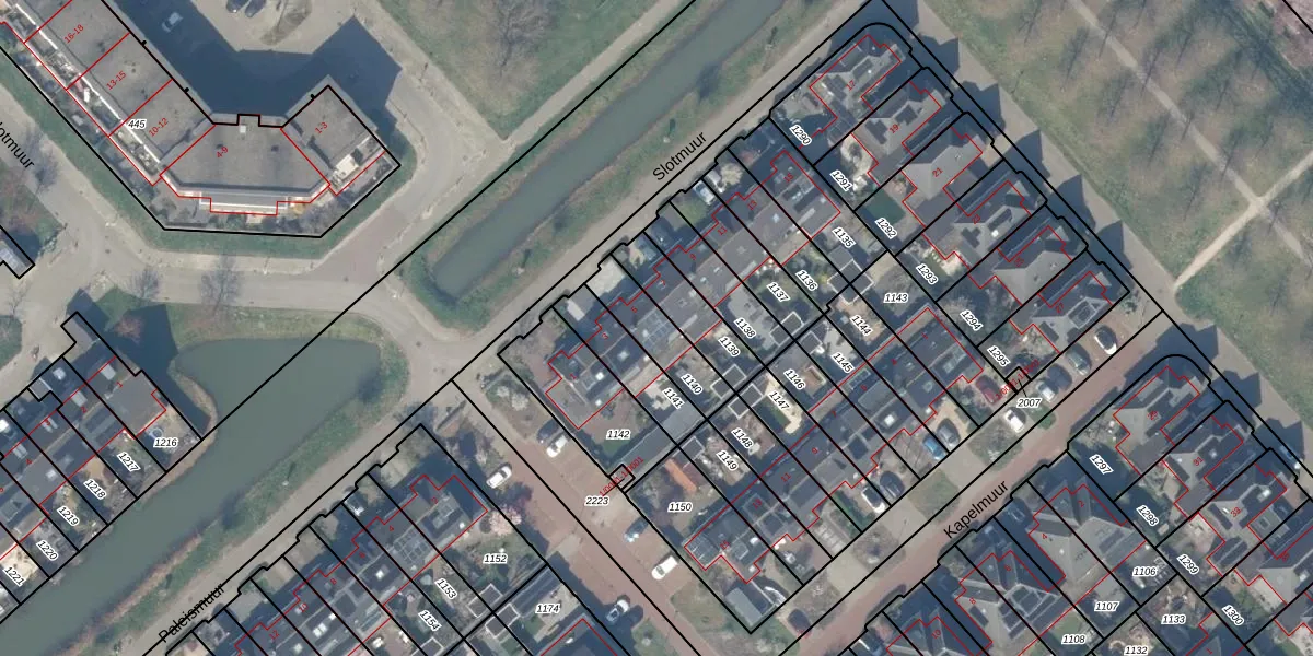 Het perceel waarop Slotmuur 5 staat heeft een oppervlakte van 170 m². Dit is een middelgroot perceel. De perceeloppervlakte wordt geregistreerd door het Kadaster. Gedetailleerde informatie over de maten van dit perceel kunt u vinden in het rapport Kadastrale kaart met maatvoering van Slotmuur 5.