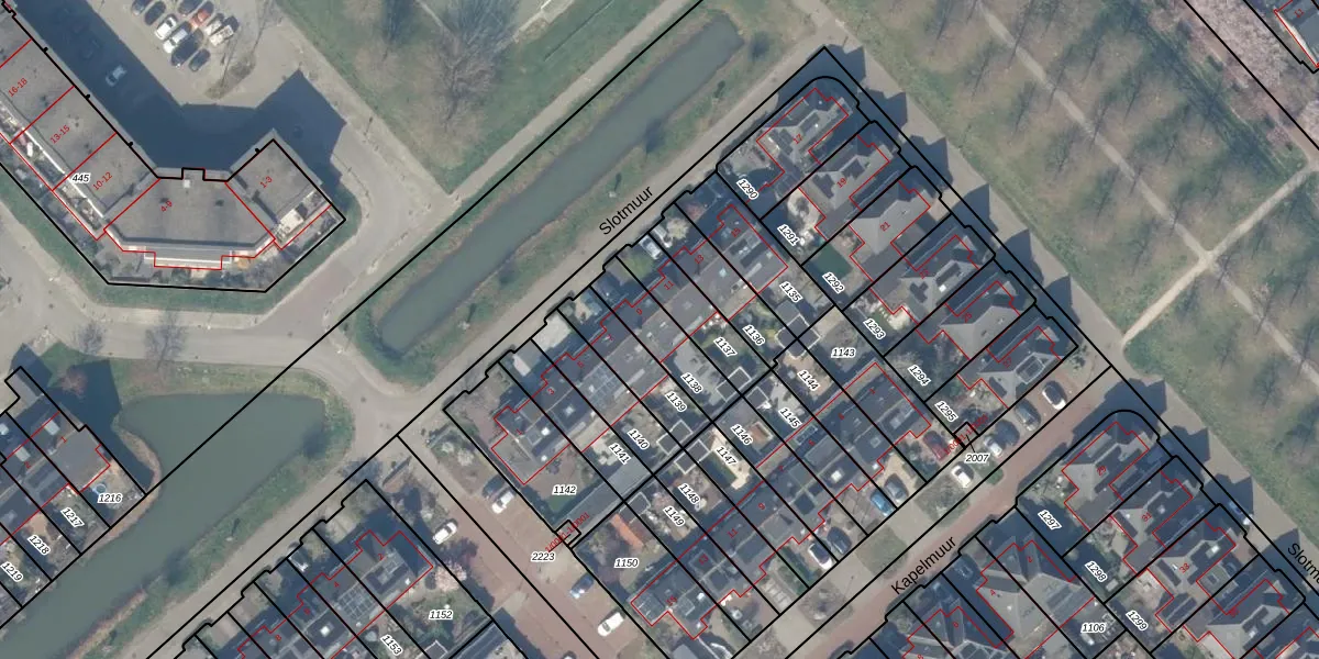 Het perceel waarop Slotmuur 9 staat heeft een oppervlakte van 170 m². Dit is een middelgroot perceel. De perceeloppervlakte wordt geregistreerd door het Kadaster. Gedetailleerde informatie over de maten van dit perceel kunt u vinden in het rapport Kadastrale kaart met maatvoering van Slotmuur 9.