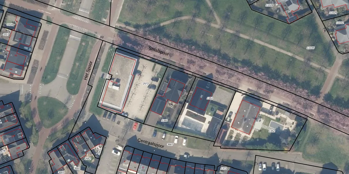 Het perceel waarop Smalspoor 1 staat heeft een oppervlakte van 597 m². Dit is een groot perceel. De perceeloppervlakte wordt geregistreerd door het Kadaster. Gedetailleerde informatie over de maten van dit perceel kunt u vinden in het rapport Kadastrale kaart met maatvoering van Smalspoor 1.