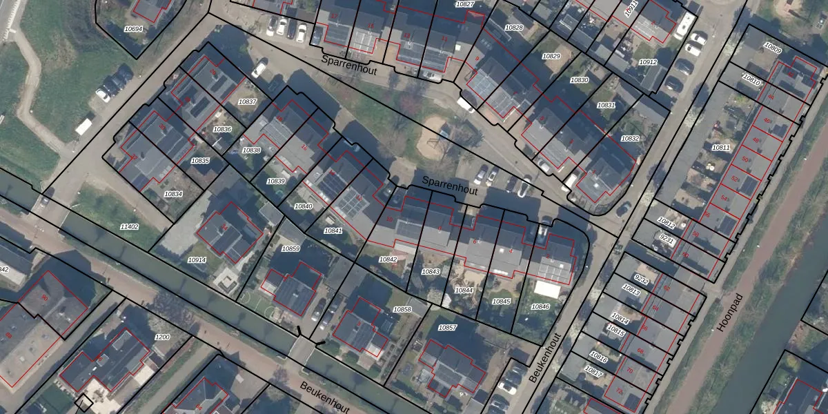 Sparrenhout 10 is gelegen op kadastraal perceel HTN04A10842. Deze kadastrale aanduiding is uniek en wordt gebruikt door het Kadaster om eigendomsrechten en andere zakelijke rechten vast te leggen. Het perceel maakt onderdeel uit van de kadastrale gemeente Houten.