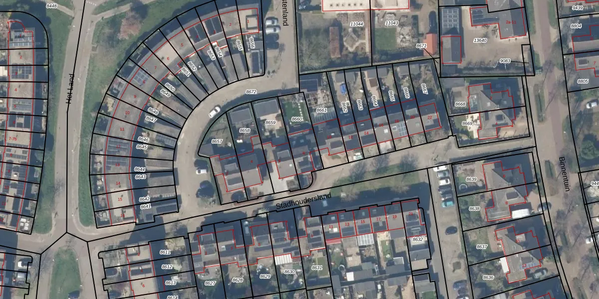 Stadhoudersland 8 is gelegen op kadastraal perceel HTN04A8660. Deze kadastrale aanduiding is uniek en wordt gebruikt door het Kadaster om eigendomsrechten en andere zakelijke rechten vast te leggen. Het perceel maakt onderdeel uit van de kadastrale gemeente Houten.