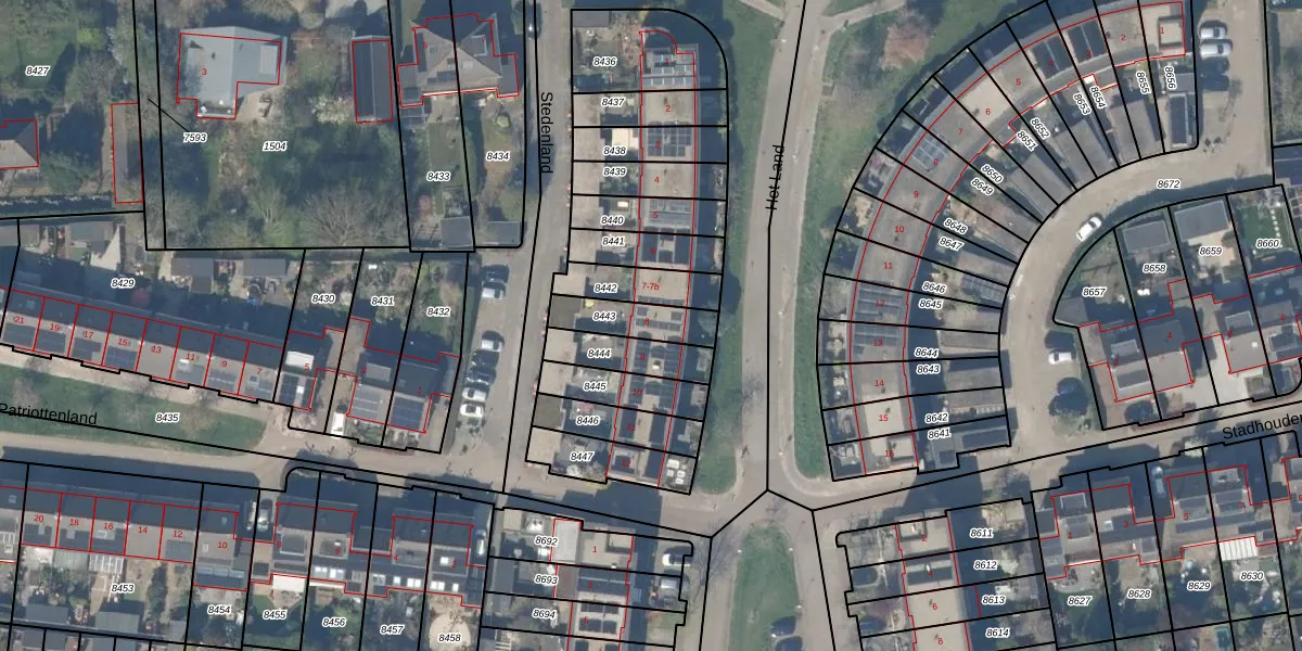 Stedenland 8 is gelegen op kadastraal perceel HTN04A8443. Deze kadastrale aanduiding is uniek en wordt gebruikt door het Kadaster om eigendomsrechten en andere zakelijke rechten vast te leggen. Het perceel maakt onderdeel uit van de kadastrale gemeente Houten.