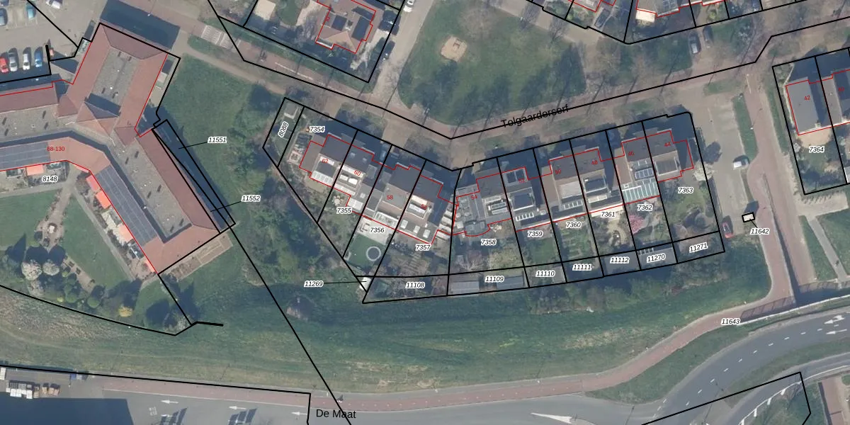 Tolgaarderserf 56 is gelegen op kadastraal perceel HTN04A7357. Deze kadastrale aanduiding is uniek en wordt gebruikt door het Kadaster om eigendomsrechten en andere zakelijke rechten vast te leggen. Het perceel maakt onderdeel uit van de kadastrale gemeente Houten.