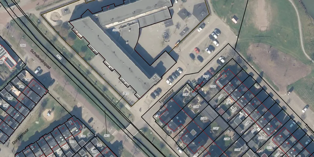 Het perceel waarop Torenmuur 1 staat heeft een oppervlakte van 2200 m². Dit is een zeer groot perceel. De perceeloppervlakte wordt geregistreerd door het Kadaster. Gedetailleerde informatie over de maten van dit perceel kunt u vinden in het rapport Kadastrale kaart met maatvoering van Torenmuur 1.