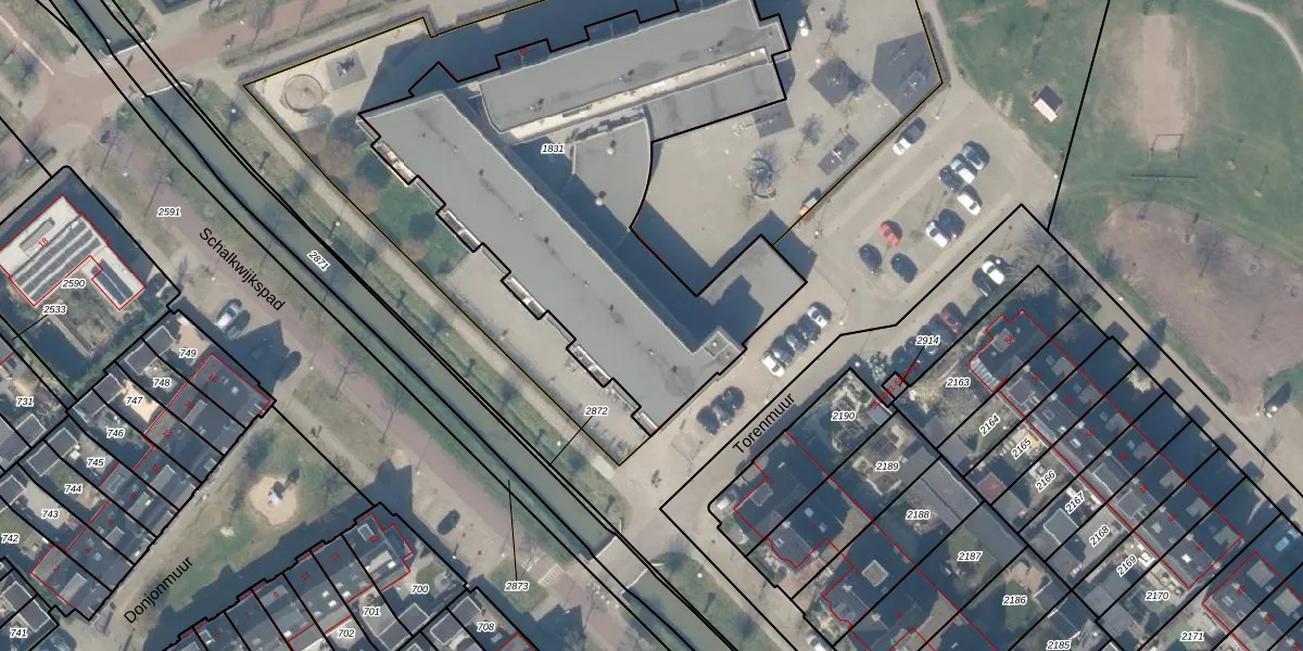 Het perceel waarop Torenmuur 35 staat heeft een oppervlakte van 2200 m². Dit is een zeer groot perceel. De perceeloppervlakte wordt geregistreerd door het Kadaster. Gedetailleerde informatie over de maten van dit perceel kunt u vinden in het rapport Kadastrale kaart met maatvoering van Torenmuur 35.