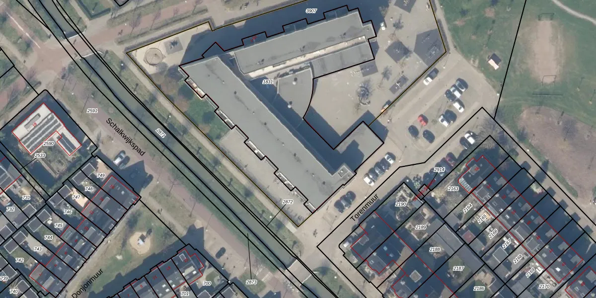 Het perceel waarop Torenmuur 37 staat heeft een oppervlakte van 2200 m². Dit is een zeer groot perceel. De perceeloppervlakte wordt geregistreerd door het Kadaster. Gedetailleerde informatie over de maten van dit perceel kunt u vinden in het rapport Kadastrale kaart met maatvoering van Torenmuur 37.