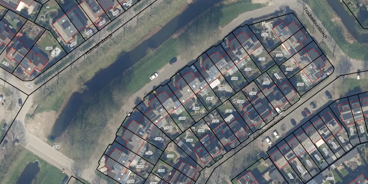 Troubadoursborch 13 is gelegen op kadastraal perceel HTN04E1546. Deze kadastrale aanduiding is uniek en wordt gebruikt door het Kadaster om eigendomsrechten en andere zakelijke rechten vast te leggen. Het perceel maakt onderdeel uit van de kadastrale gemeente Houten.