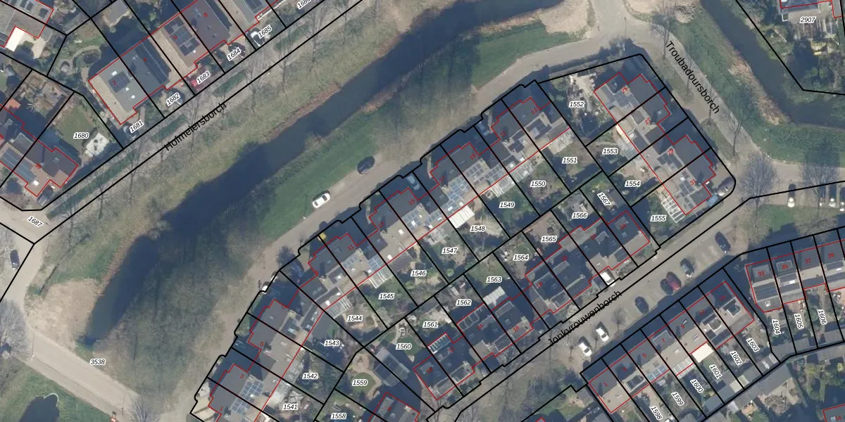 Troubadoursborch 15 is gelegen op kadastraal perceel HTN04E1547. Deze kadastrale aanduiding is uniek en wordt gebruikt door het Kadaster om eigendomsrechten en andere zakelijke rechten vast te leggen. Het perceel maakt onderdeel uit van de kadastrale gemeente Houten.