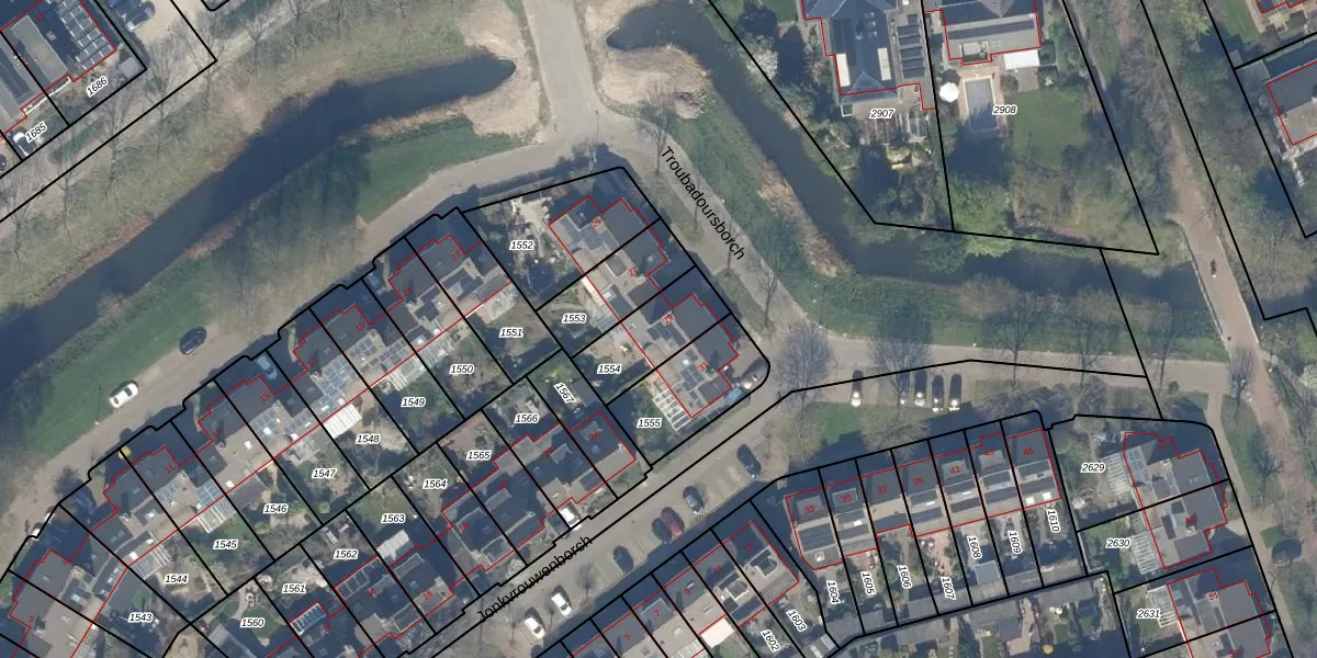 Het perceel waarop Troubadoursborch 29 staat heeft een oppervlakte van 214 m². Dit is een middelgroot perceel. De perceeloppervlakte wordt geregistreerd door het Kadaster. Gedetailleerde informatie over de maten van dit perceel kunt u vinden in het rapport Kadastrale kaart met maatvoering van Troubadoursborch 29.