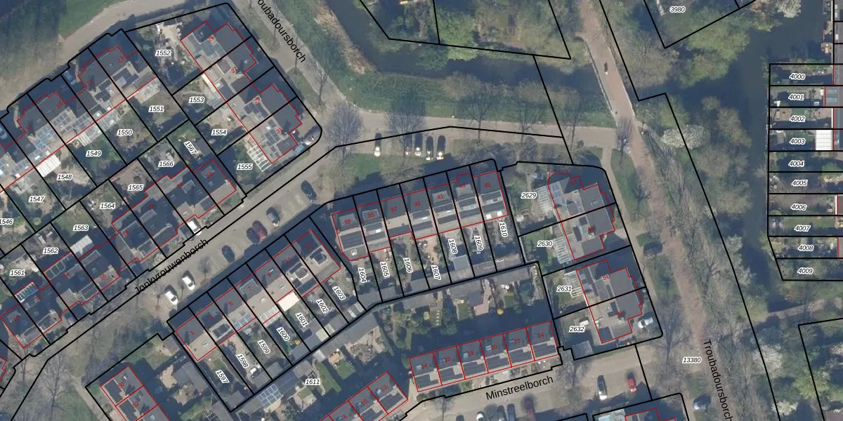 Troubadoursborch 39 is gelegen op kadastraal perceel HTN04E1607. Deze kadastrale aanduiding is uniek en wordt gebruikt door het Kadaster om eigendomsrechten en andere zakelijke rechten vast te leggen. Het perceel maakt onderdeel uit van de kadastrale gemeente Houten.