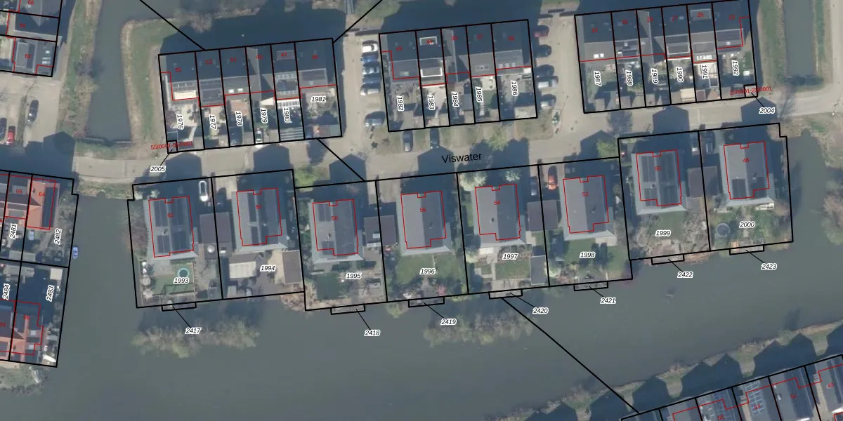 Het perceel waarop Viswater 56 staat heeft een oppervlakte van 562 m². Dit is een groot perceel. De perceeloppervlakte wordt geregistreerd door het Kadaster. Gedetailleerde informatie over de maten van dit perceel kunt u vinden in het rapport Kadastrale kaart met maatvoering van Viswater 56.