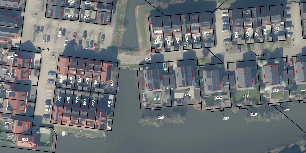 Het perceel waarop Viswater 62 staat heeft een oppervlakte van 588 m². Dit is een groot perceel. De perceeloppervlakte wordt geregistreerd door het Kadaster. Gedetailleerde informatie over de maten van dit perceel kunt u vinden in het rapport Kadastrale kaart met maatvoering van Viswater 62.