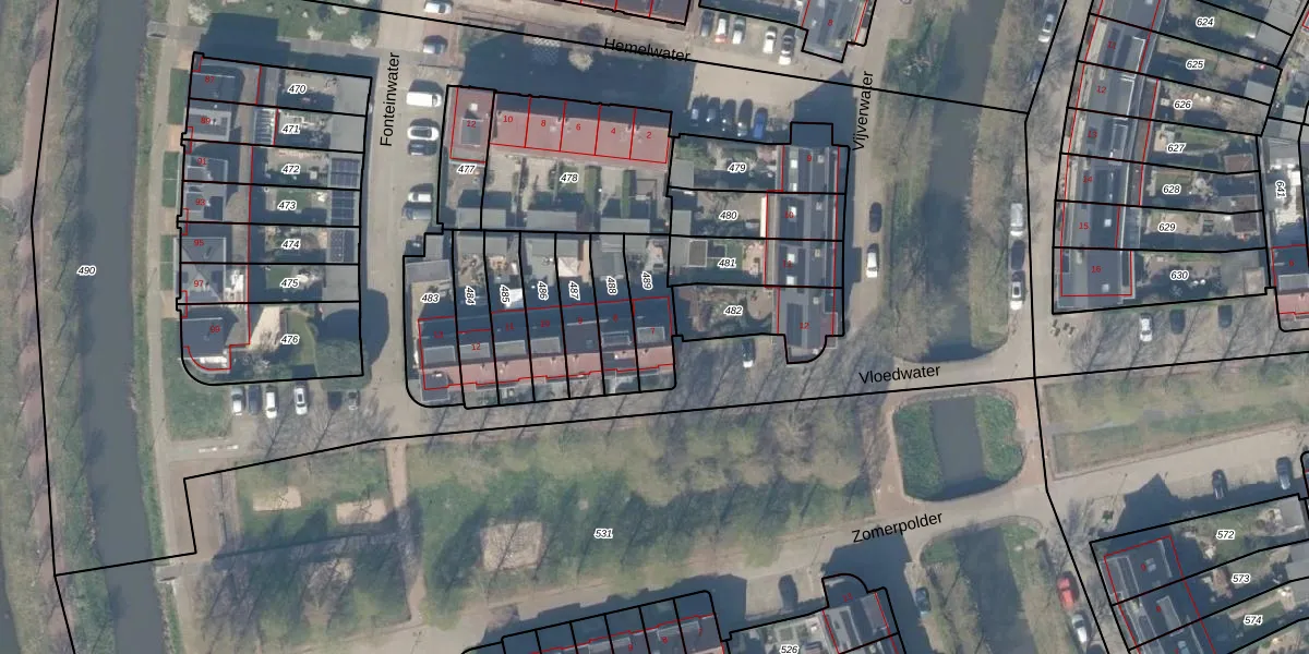 Vloedwater 7 is gelegen op kadastraal perceel HTN04H489. Deze kadastrale aanduiding is uniek en wordt gebruikt door het Kadaster om eigendomsrechten en andere zakelijke rechten vast te leggen. Het perceel maakt onderdeel uit van de kadastrale gemeente Houten.