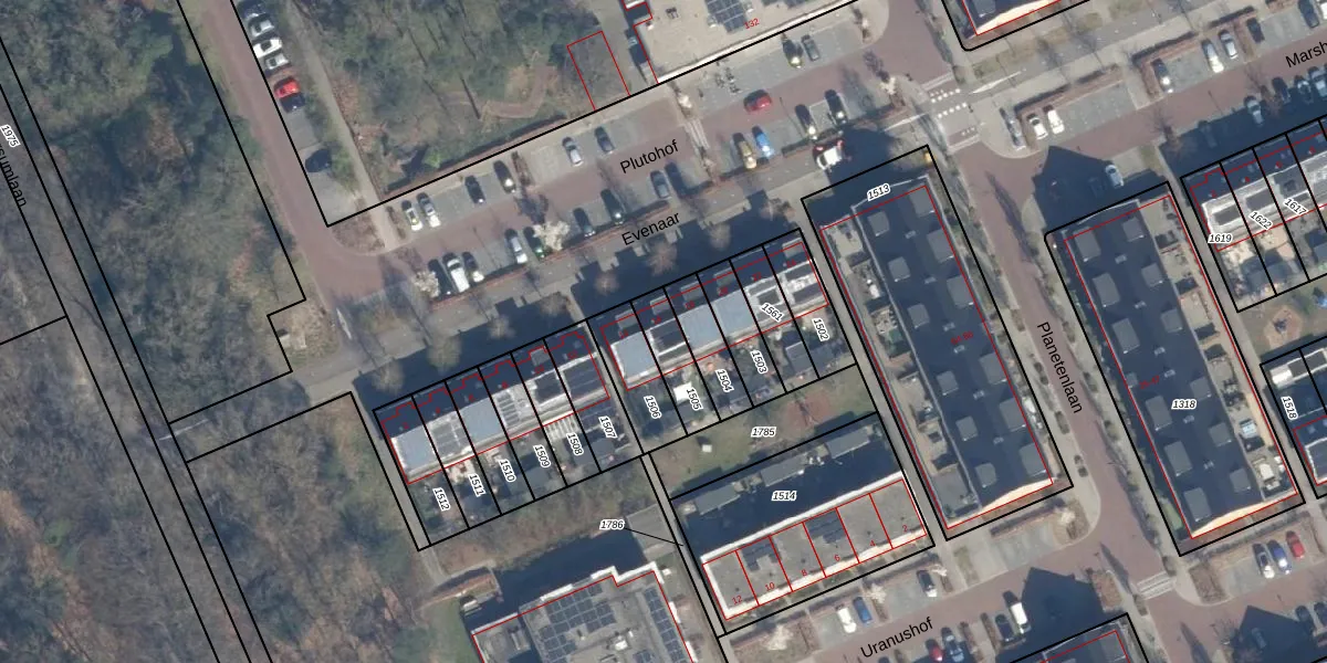 Het perceel waarop Evenaar 16 staat heeft een oppervlakte van 119 m². Dit is een middelgroot perceel. De perceeloppervlakte wordt geregistreerd door het Kadaster. Gedetailleerde informatie over de maten van dit perceel kunt u vinden in het rapport Kadastrale kaart met maatvoering van Evenaar 16.