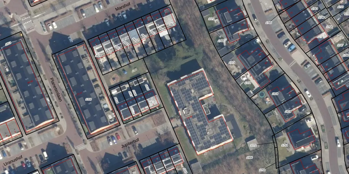 Het perceel waarop Jupiterhof 16 staat heeft een oppervlakte van 9810 m². Dit is een zeer groot perceel. De perceeloppervlakte wordt geregistreerd door het Kadaster. Gedetailleerde informatie over de maten van dit perceel kunt u vinden in het rapport Kadastrale kaart met maatvoering van Jupiterhof 16.