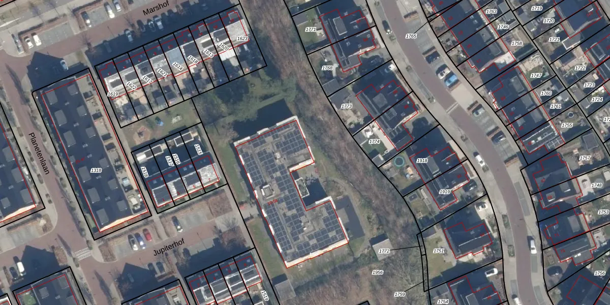 Het perceel waarop Jupiterhof 22 staat heeft een oppervlakte van 9810 m². Dit is een zeer groot perceel. De perceeloppervlakte wordt geregistreerd door het Kadaster. Gedetailleerde informatie over de maten van dit perceel kunt u vinden in het rapport Kadastrale kaart met maatvoering van Jupiterhof 22.