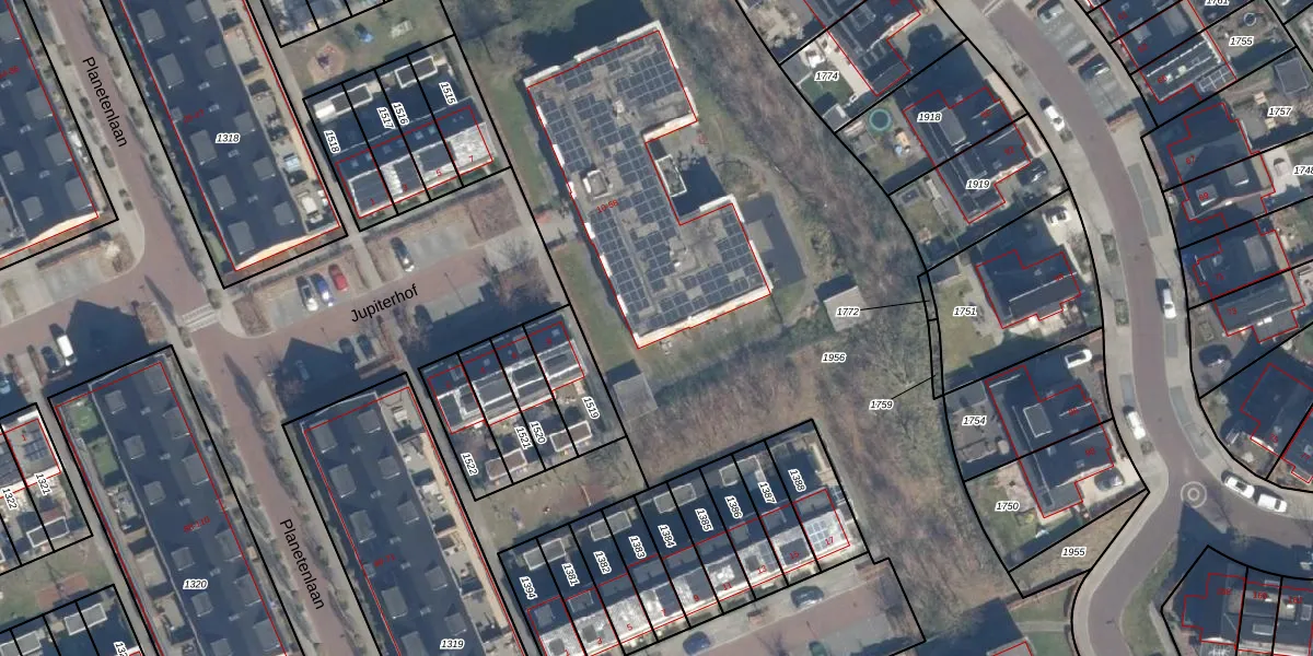 Het perceel waarop Jupiterhof 30 staat heeft een oppervlakte van 9810 m². Dit is een zeer groot perceel. De perceeloppervlakte wordt geregistreerd door het Kadaster. Gedetailleerde informatie over de maten van dit perceel kunt u vinden in het rapport Kadastrale kaart met maatvoering van Jupiterhof 30.