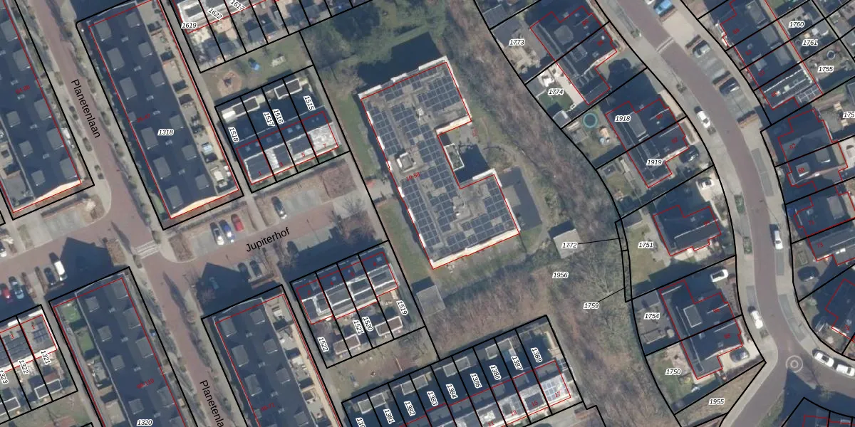 Het perceel waarop Jupiterhof 34 staat heeft een oppervlakte van 9810 m². Dit is een zeer groot perceel. De perceeloppervlakte wordt geregistreerd door het Kadaster. Gedetailleerde informatie over de maten van dit perceel kunt u vinden in het rapport Kadastrale kaart met maatvoering van Jupiterhof 34.