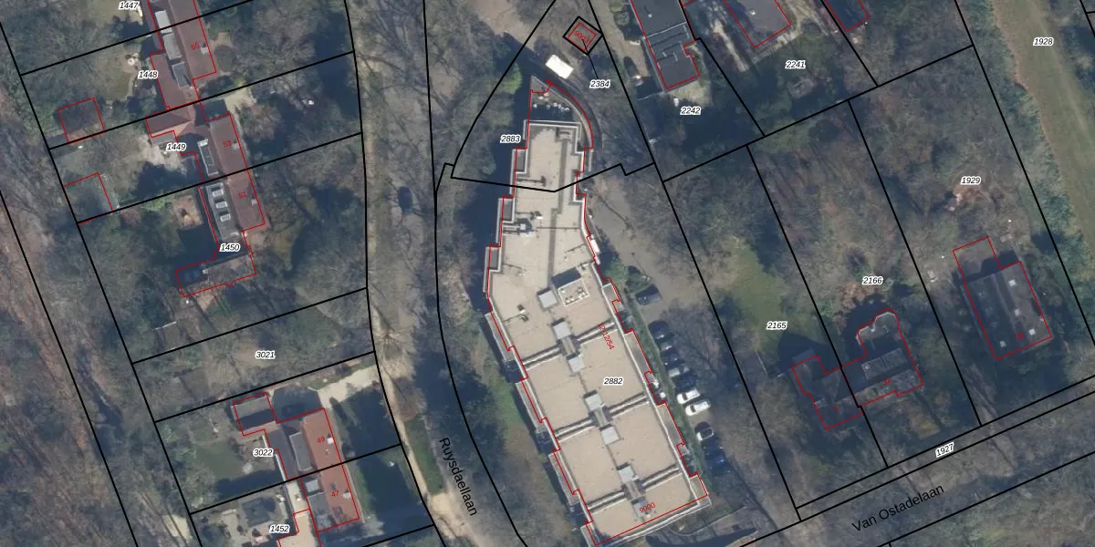 Ruysdaellaan 12-27 is gelegen op kadastraal perceel ZEI00K2882. Deze kadastrale aanduiding is uniek en wordt gebruikt door het Kadaster om eigendomsrechten en andere zakelijke rechten vast te leggen. Het perceel maakt onderdeel uit van de kadastrale gemeente Zeist.