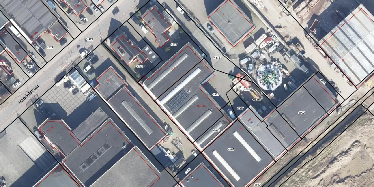 Het perceel waarop Handelstraat 11-d staat heeft een oppervlakte van 1048 m². Dit is een zeer groot perceel. De perceeloppervlakte wordt geregistreerd door het Kadaster. Gedetailleerde informatie over de maten van dit perceel kunt u vinden in het rapport Kadastrale kaart met maatvoering van Handelstraat 11-d.