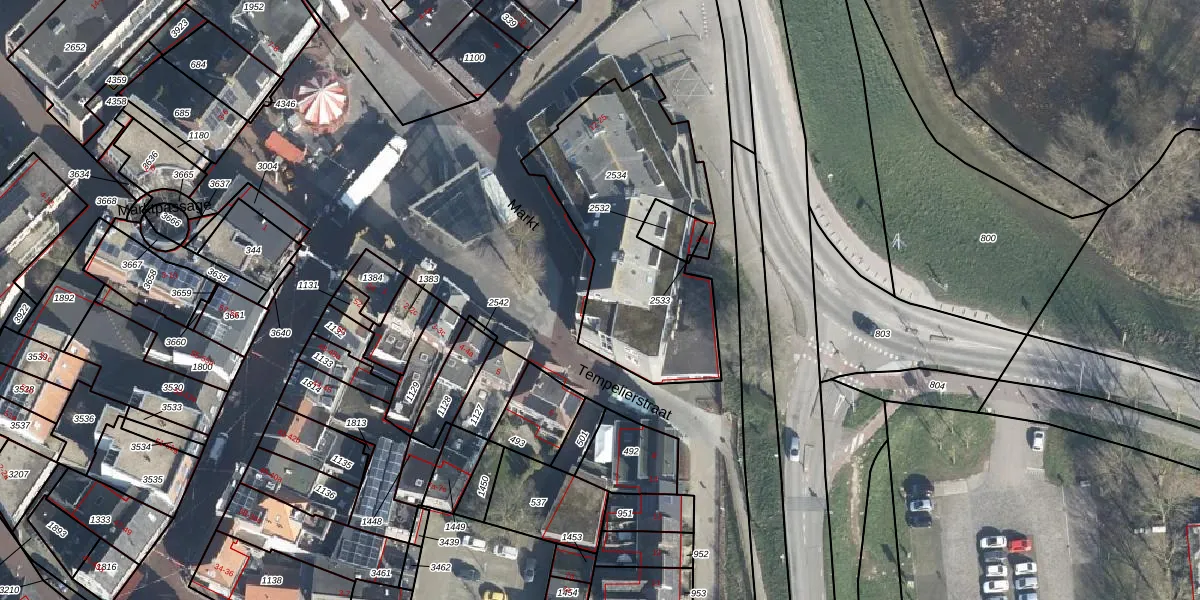 Het perceel waarop Markt 12 staat heeft een oppervlakte van 985 m². Dit is een groot perceel. De perceeloppervlakte wordt geregistreerd door het Kadaster. Gedetailleerde informatie over de maten van dit perceel kunt u vinden in het rapport Kadastrale kaart met maatvoering van Markt 12.