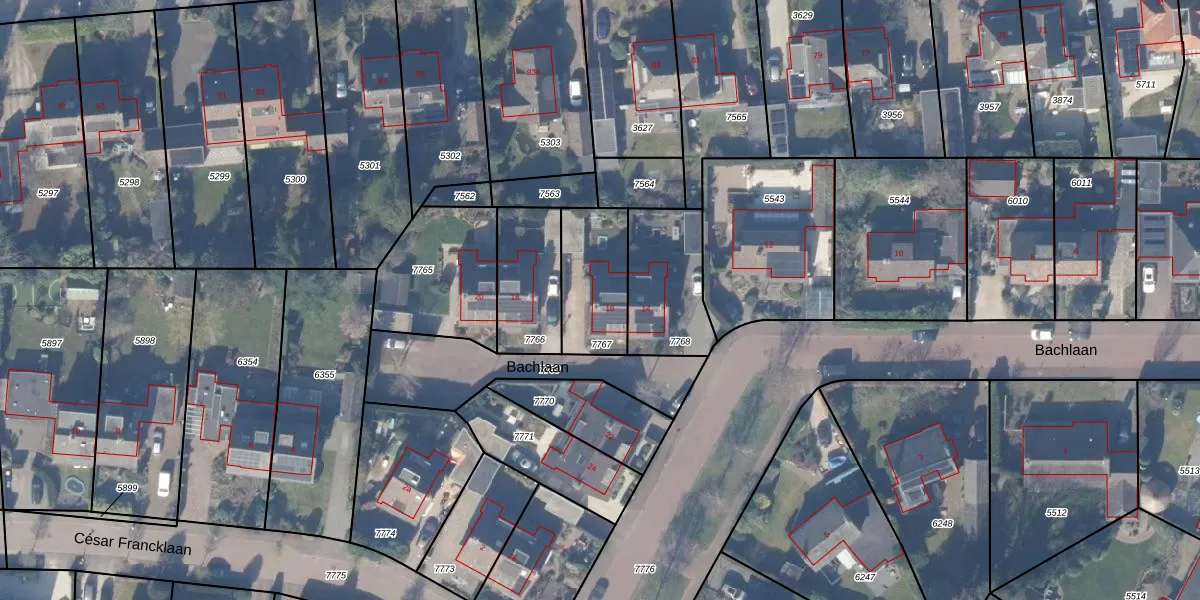 Bachlaan 16 is gelegen op kadastraal perceel HZN00B7767. Deze kadastrale aanduiding is uniek en wordt gebruikt door het Kadaster om eigendomsrechten en andere zakelijke rechten vast te leggen. Het perceel maakt onderdeel uit van de kadastrale gemeente Huizen.