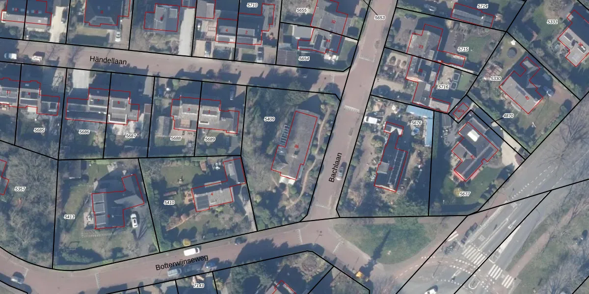 Het perceel waarop Bachlaan 36 staat heeft een oppervlakte van 1207 m². Dit is een zeer groot perceel. De perceeloppervlakte wordt geregistreerd door het Kadaster. Gedetailleerde informatie over de maten van dit perceel kunt u vinden in het rapport Kadastrale kaart met maatvoering van Bachlaan 36.