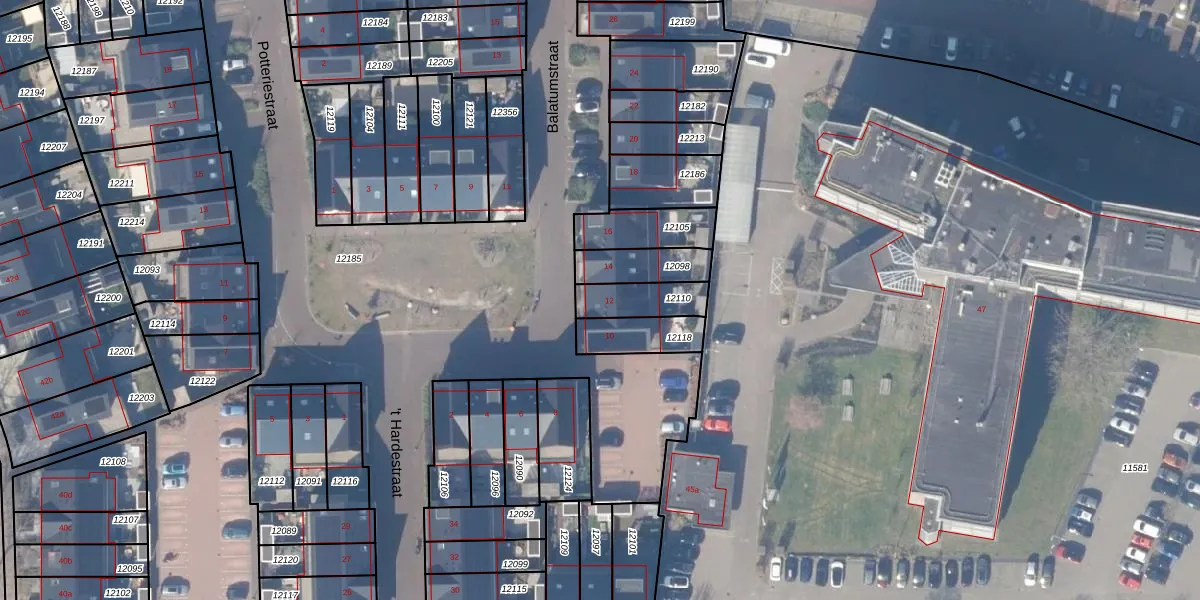 Balatumstraat 12 is gelegen op kadastraal perceel HZN00C12110. Deze kadastrale aanduiding is uniek en wordt gebruikt door het Kadaster om eigendomsrechten en andere zakelijke rechten vast te leggen. Het perceel maakt onderdeel uit van de kadastrale gemeente Huizen.