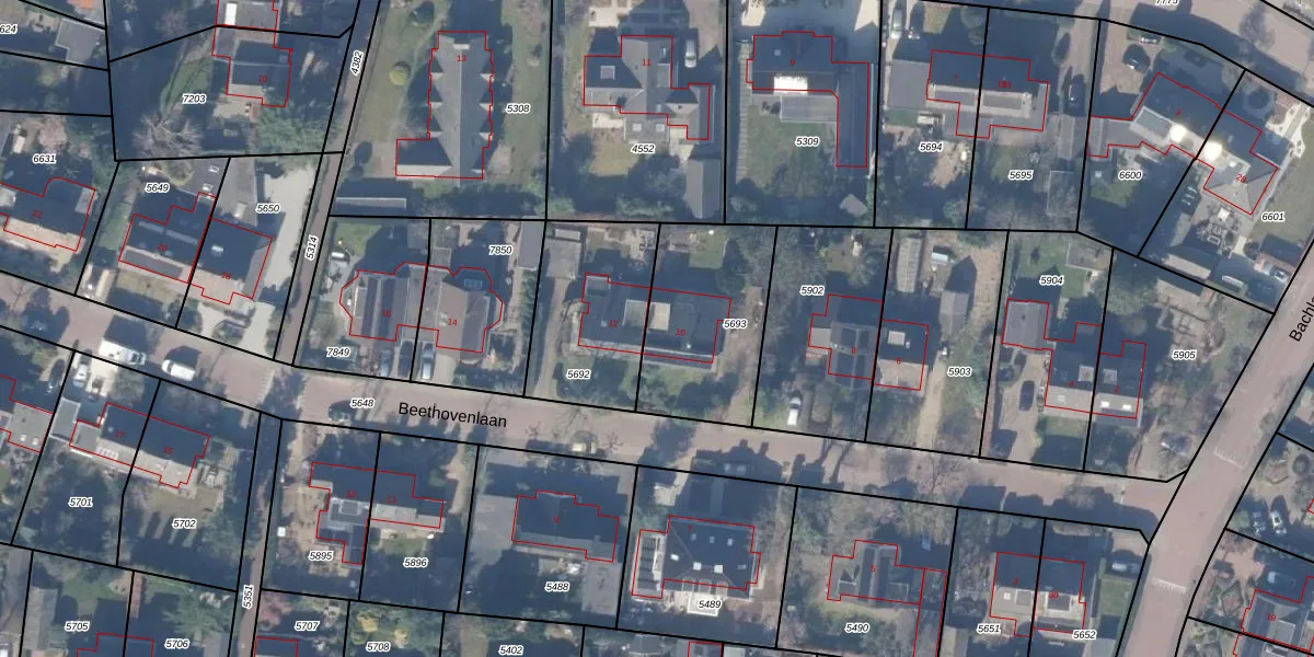 Beethovenlaan 10 is gelegen op kadastraal perceel HZN00B5693. Deze kadastrale aanduiding is uniek en wordt gebruikt door het Kadaster om eigendomsrechten en andere zakelijke rechten vast te leggen. Het perceel maakt onderdeel uit van de kadastrale gemeente Huizen.