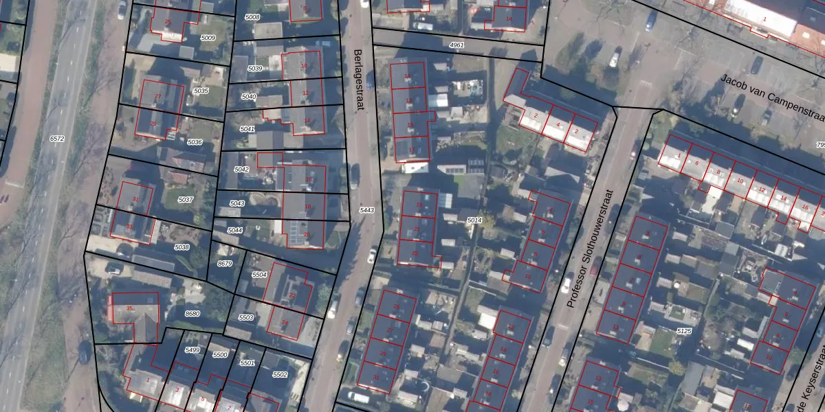 Het perceel waarop Berlagestraat 19 staat heeft een oppervlakte van 4370 m². Dit is een zeer groot perceel. De perceeloppervlakte wordt geregistreerd door het Kadaster. Gedetailleerde informatie over de maten van dit perceel kunt u vinden in het rapport Kadastrale kaart met maatvoering van Berlagestraat 19.