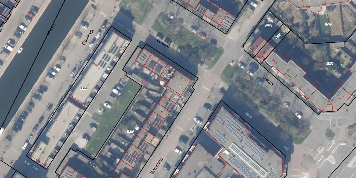 Het adres ligt op het perceel HZN00-E-1725, dat zich in de kadastrale gemeente Huizen bevindt. De gemiddelde perceeloppervlakte in de kadastrale gemeente Huizen is 1437,02 m². Dit perceel is met zijn 2939 m² dus groter dan gemiddeld. De grootste perceeloppervlakte in de kadastrale gemeente is 4,26 km². De kleinste oppervlakte bedraagt 0 m². Op het perceel zijn 34 adressen aanwezig. In de Basisregistratie Kadaster (BRK) werden de grenzen van het perceel geregistreerd op 30-06-2010.