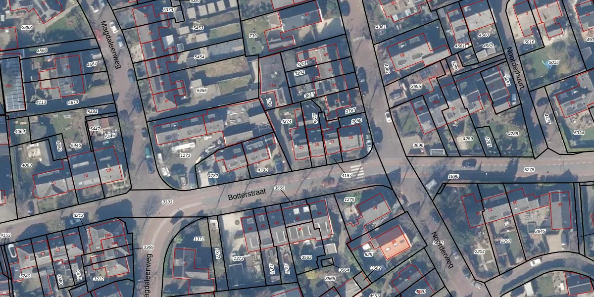 Botterstraat 23 is gelegen op kadastraal perceel HZN00D4274. Deze kadastrale aanduiding is uniek en wordt gebruikt door het Kadaster om eigendomsrechten en andere zakelijke rechten vast te leggen. Het perceel maakt onderdeel uit van de kadastrale gemeente Huizen.