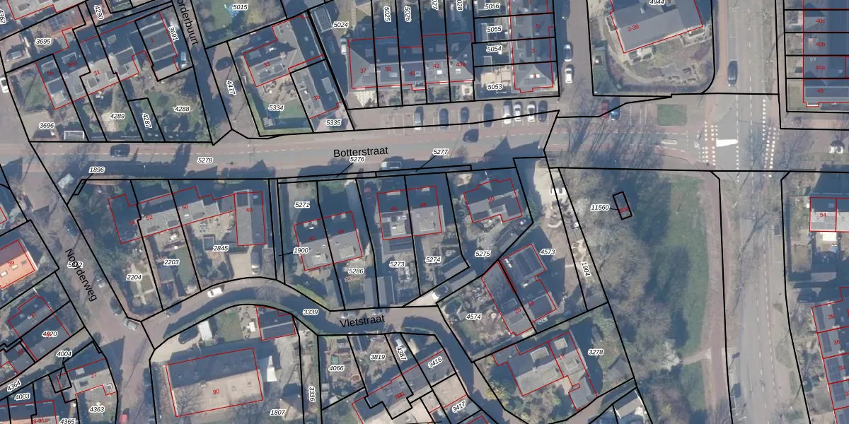 Het perceel waarop Botterstraat 48 staat heeft een oppervlakte van 276 m². Dit is een middelgroot perceel. De perceeloppervlakte wordt geregistreerd door het Kadaster. Gedetailleerde informatie over de maten van dit perceel kunt u vinden in het rapport Kadastrale kaart met maatvoering van Botterstraat 48.