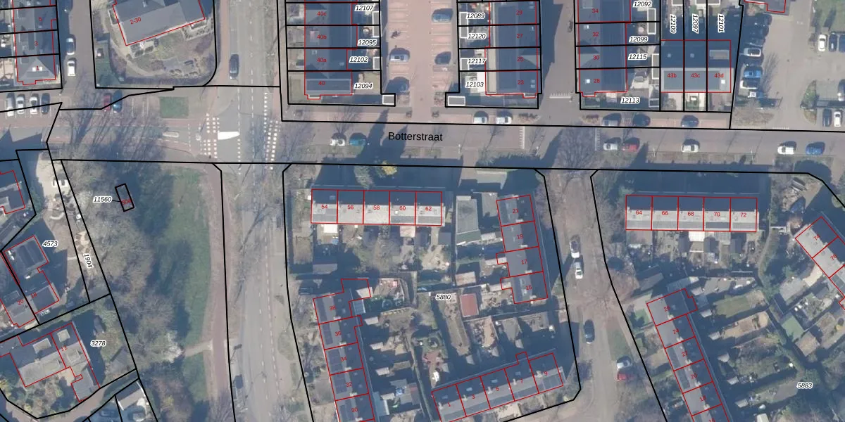 Het perceel waarop Botterstraat 62 staat heeft een oppervlakte van 4144 m². Dit is een zeer groot perceel. De perceeloppervlakte wordt geregistreerd door het Kadaster. Gedetailleerde informatie over de maten van dit perceel kunt u vinden in het rapport Kadastrale kaart met maatvoering van Botterstraat 62.