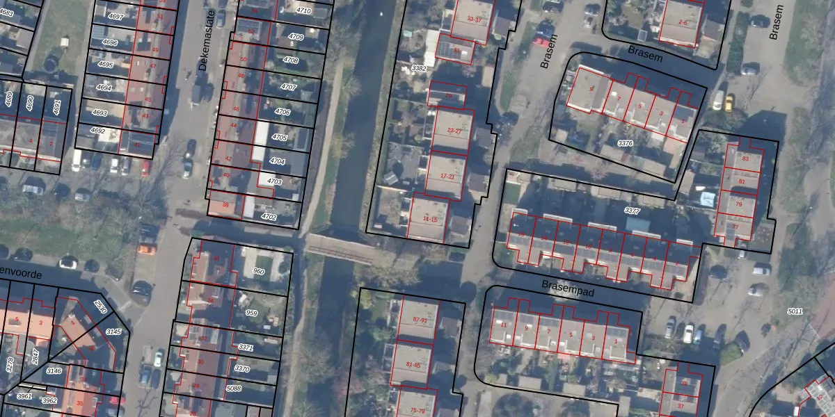 Het perceel waarop Brasem 15 staat heeft een oppervlakte van 2080 m². Dit is een zeer groot perceel. De perceeloppervlakte wordt geregistreerd door het Kadaster. Gedetailleerde informatie over de maten van dit perceel kunt u vinden in het rapport Kadastrale kaart met maatvoering van Brasem 15.