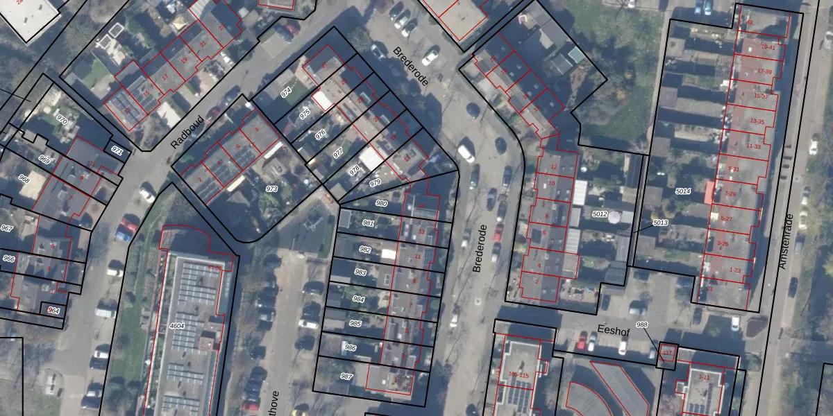 Brederode 15 is gelegen op kadastraal perceel HZN00E980. Deze kadastrale aanduiding is uniek en wordt gebruikt door het Kadaster om eigendomsrechten en andere zakelijke rechten vast te leggen. Het perceel maakt onderdeel uit van de kadastrale gemeente Huizen.