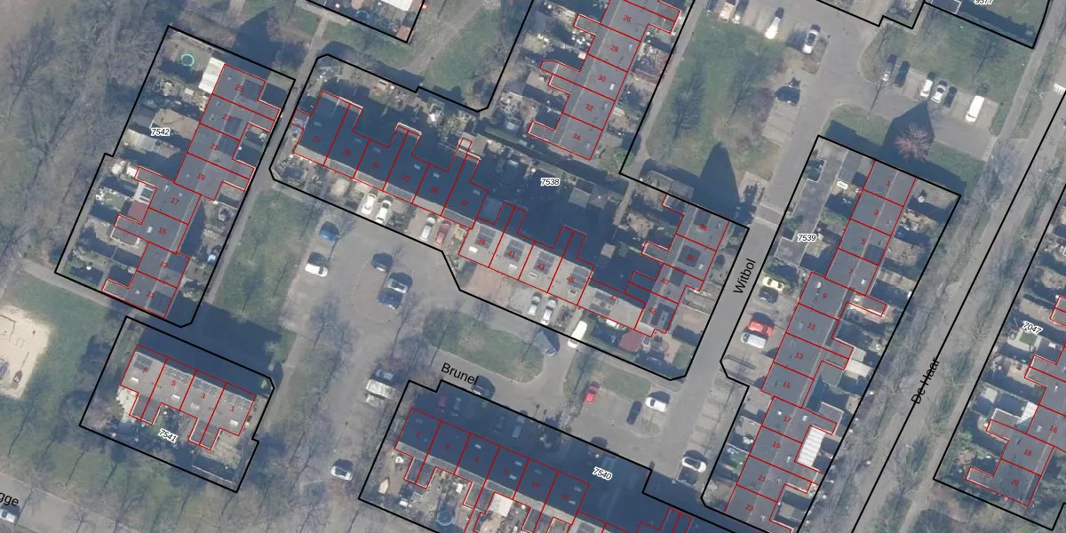 Het perceel waarop Brunel 43 staat heeft een oppervlakte van 4257 m². Dit is een zeer groot perceel. De perceeloppervlakte wordt geregistreerd door het Kadaster. Gedetailleerde informatie over de maten van dit perceel kunt u vinden in het rapport Kadastrale kaart met maatvoering van Brunel 43.