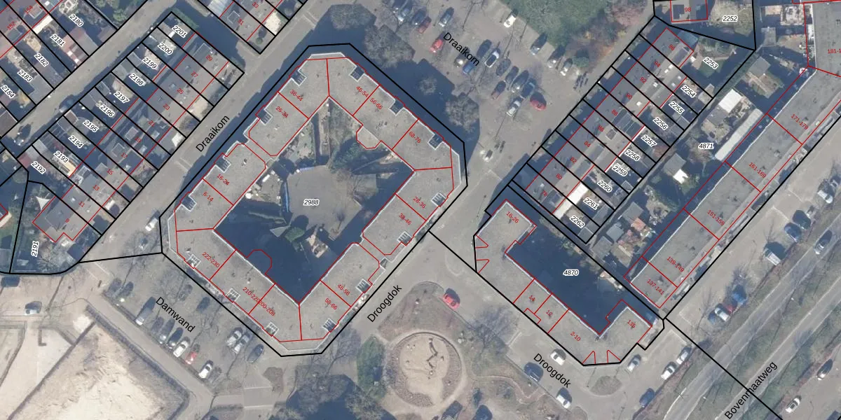 Het perceel waarop Droogdok 28 staat heeft een oppervlakte van 3265 m². Dit is een zeer groot perceel. De perceeloppervlakte wordt geregistreerd door het Kadaster. Gedetailleerde informatie over de maten van dit perceel kunt u vinden in het rapport Kadastrale kaart met maatvoering van Droogdok 28.