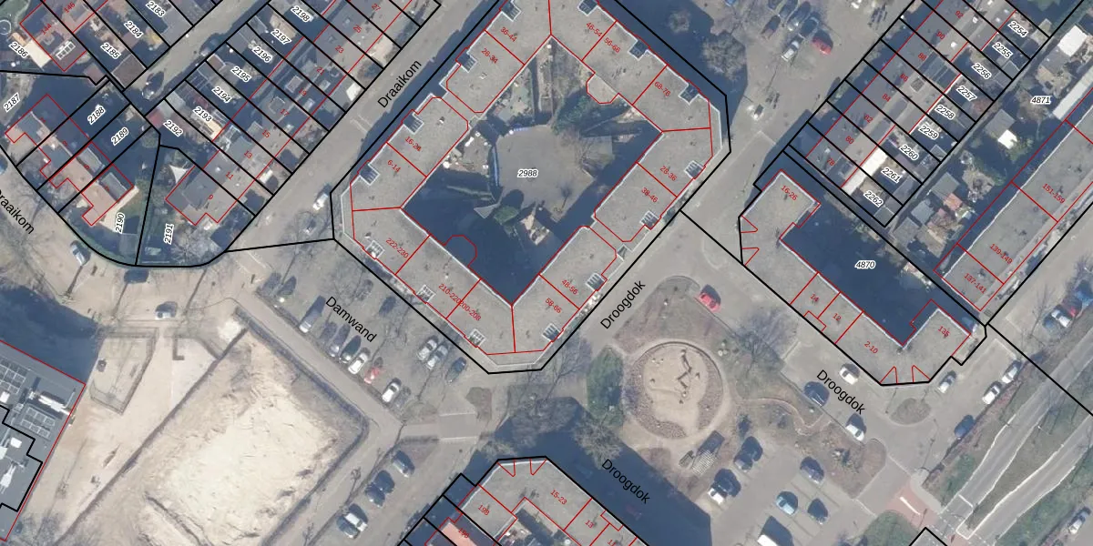 Het perceel waarop Droogdok 56 staat heeft een oppervlakte van 3265 m². Dit is een zeer groot perceel. De perceeloppervlakte wordt geregistreerd door het Kadaster. Gedetailleerde informatie over de maten van dit perceel kunt u vinden in het rapport Kadastrale kaart met maatvoering van Droogdok 56.
