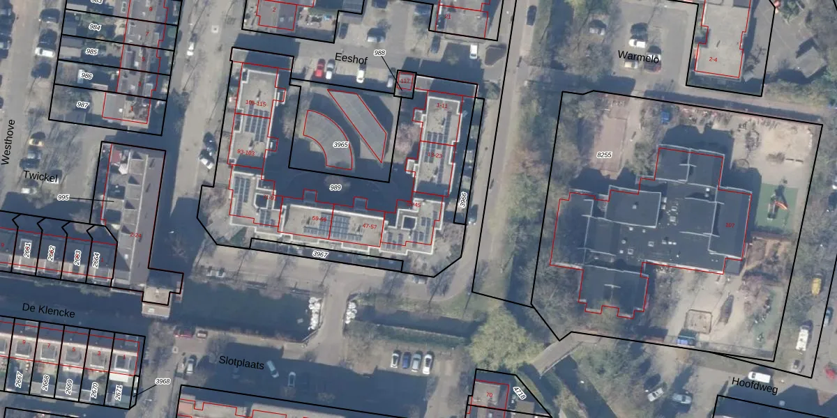 Het perceel waarop Eeshof 29 staat heeft een oppervlakte van 2045 m². Dit is een zeer groot perceel. De perceeloppervlakte wordt geregistreerd door het Kadaster. Gedetailleerde informatie over de maten van dit perceel kunt u vinden in het rapport Kadastrale kaart met maatvoering van Eeshof 29.