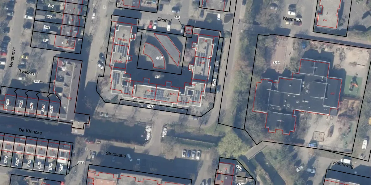 Het perceel waarop Eeshof 33 staat heeft een oppervlakte van 2045 m². Dit is een zeer groot perceel. De perceeloppervlakte wordt geregistreerd door het Kadaster. Gedetailleerde informatie over de maten van dit perceel kunt u vinden in het rapport Kadastrale kaart met maatvoering van Eeshof 33.